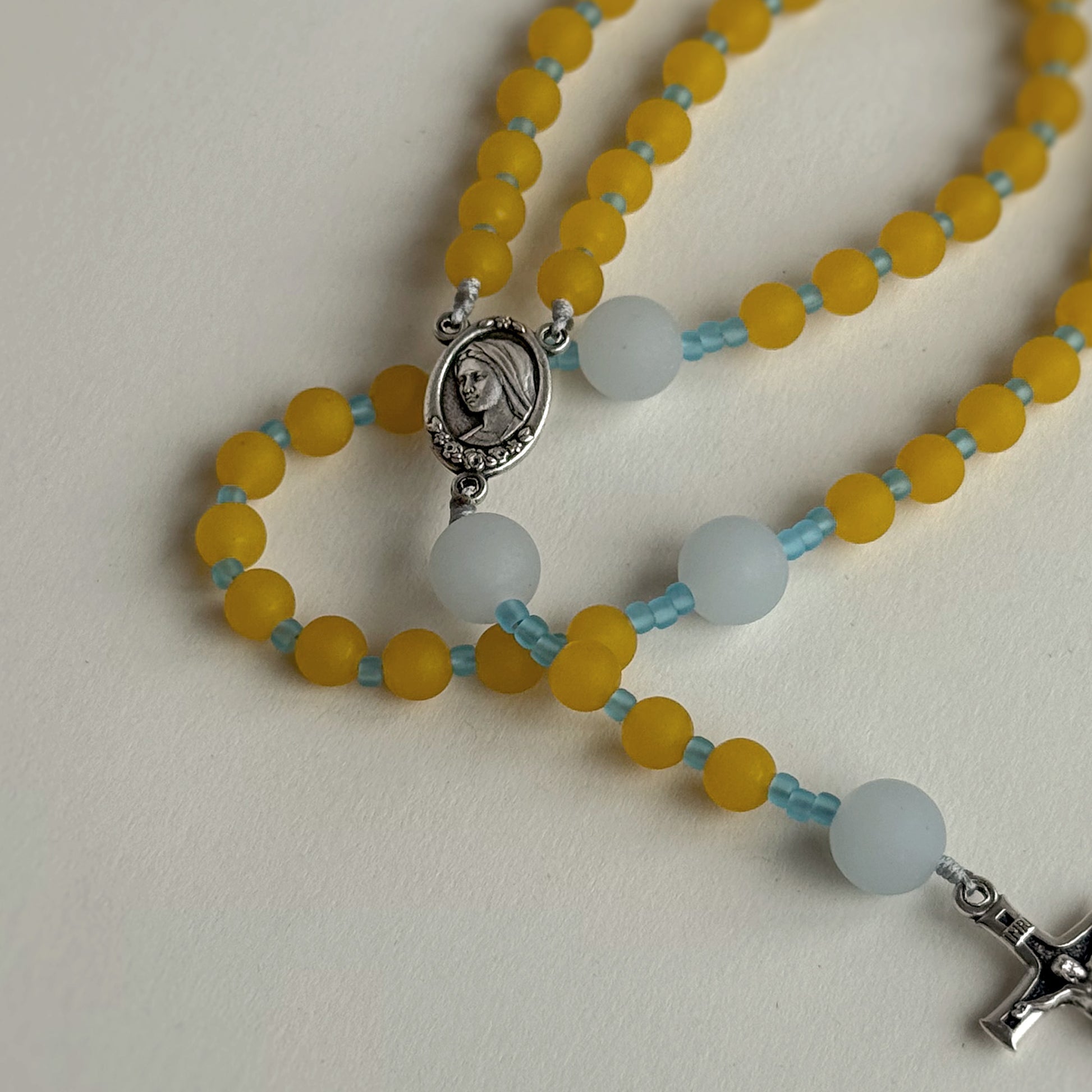 Finished with a Divine Mother medal and a silver crucifix, each rosary is handmade by a mother and daughter as a quiet act of devotion.