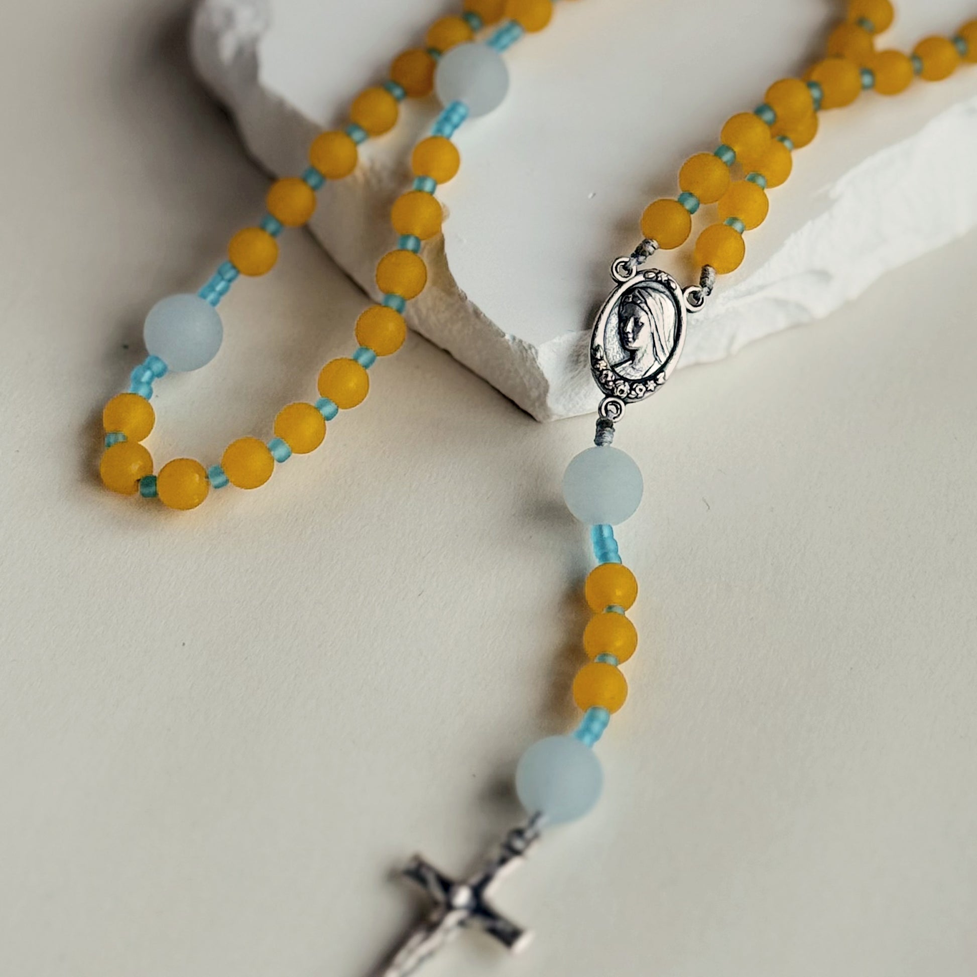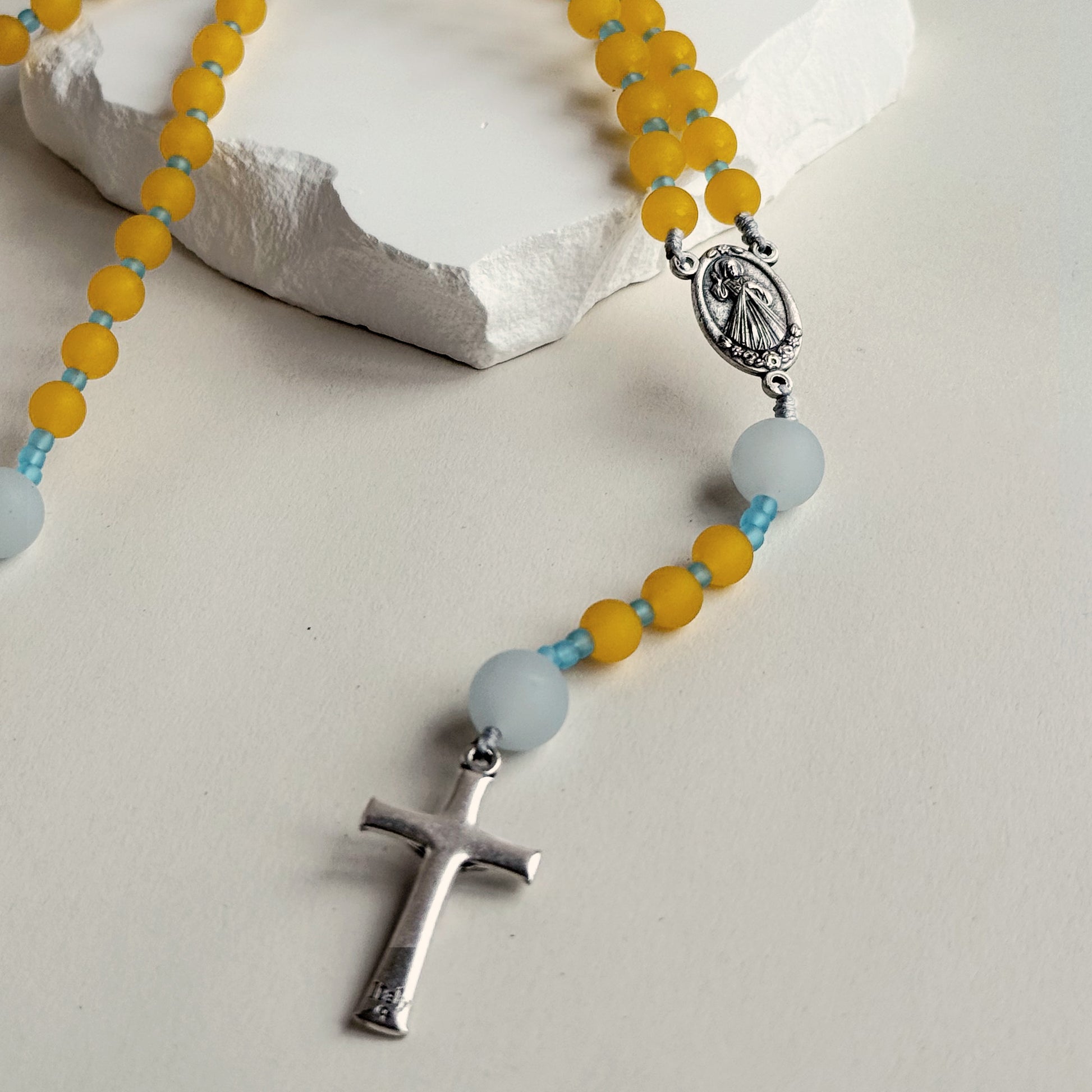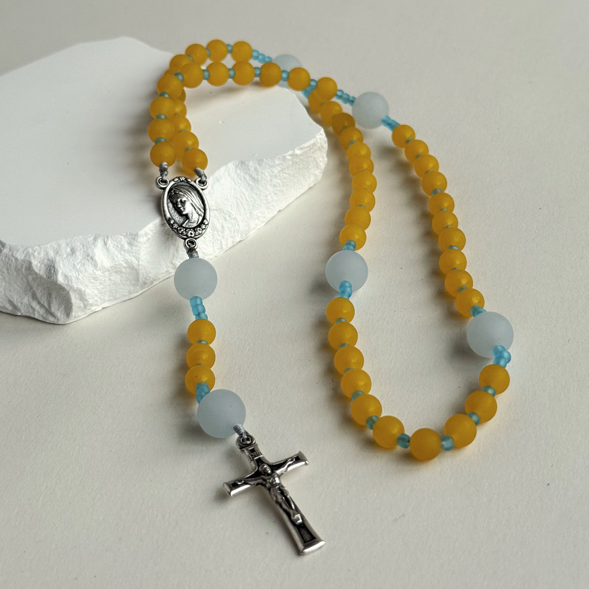 A warm amber palette shaped in matte natural stone, paired with soft chalcedony and aqua-toned spacers. Bright yet grounded, this rosary carries a quiet radiance suited for steady, reflective prayer.