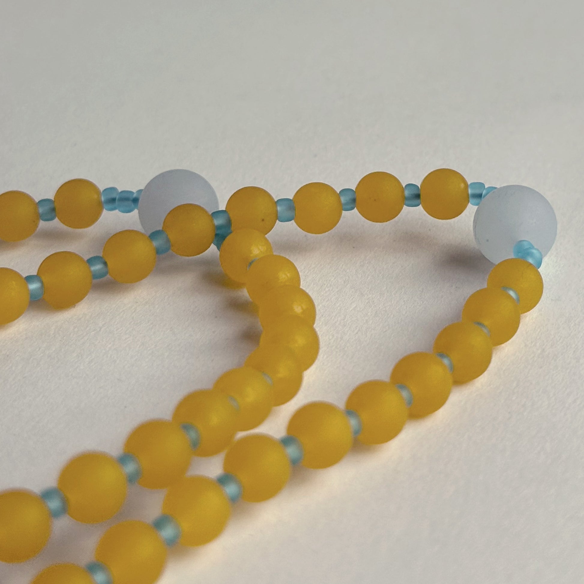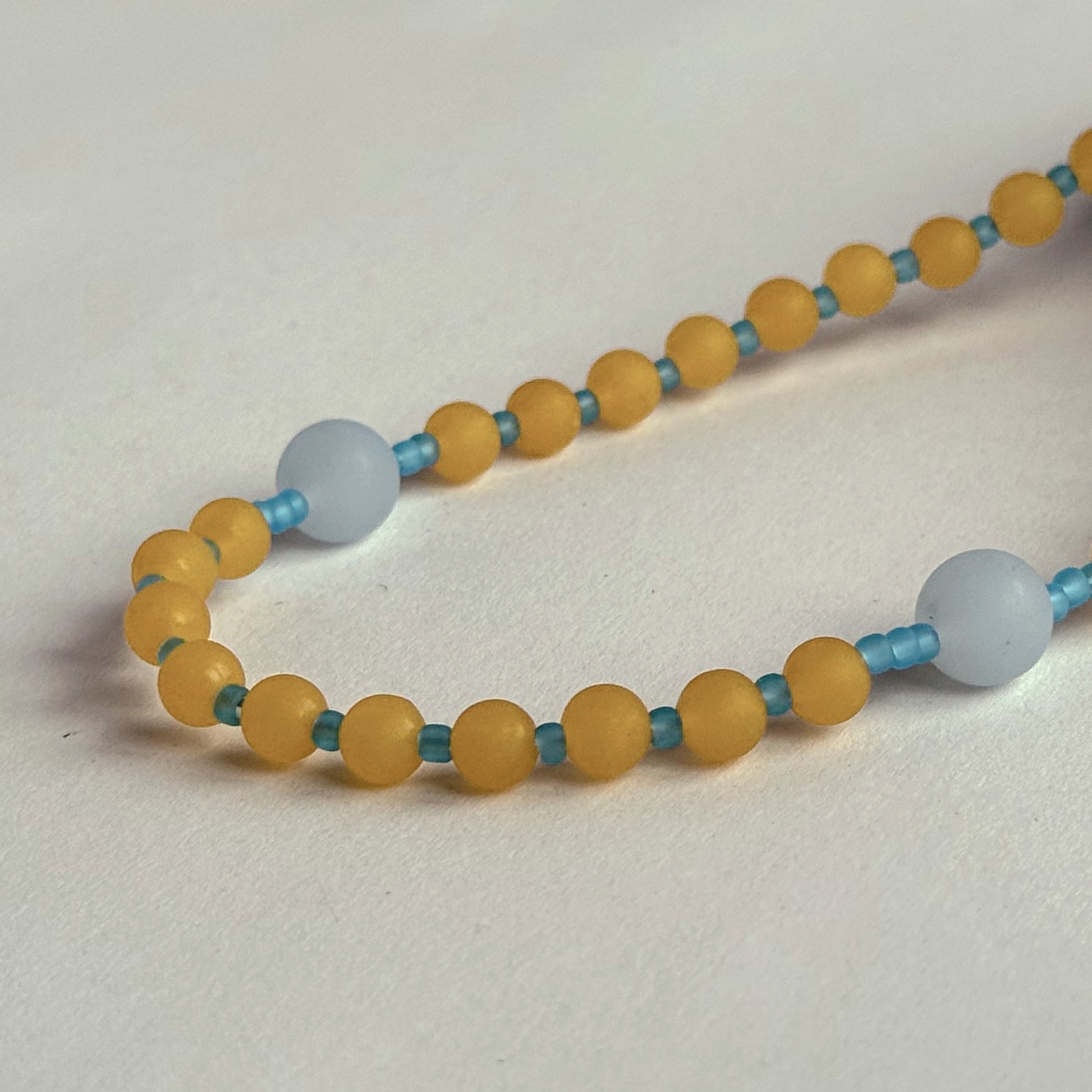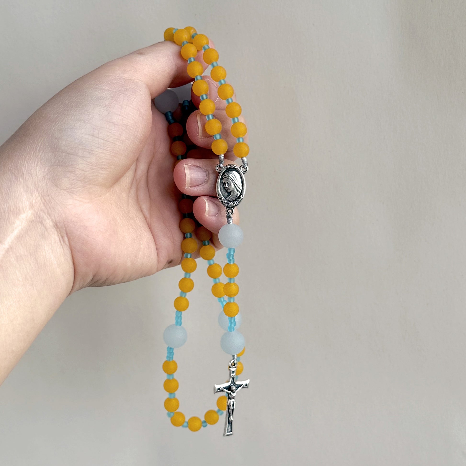 A warm amber palette shaped in matte natural stone, paired with soft chalcedony and aqua-toned spacers. Bright yet grounded, this rosary carries a quiet radiance suited for steady, reflective prayer.
