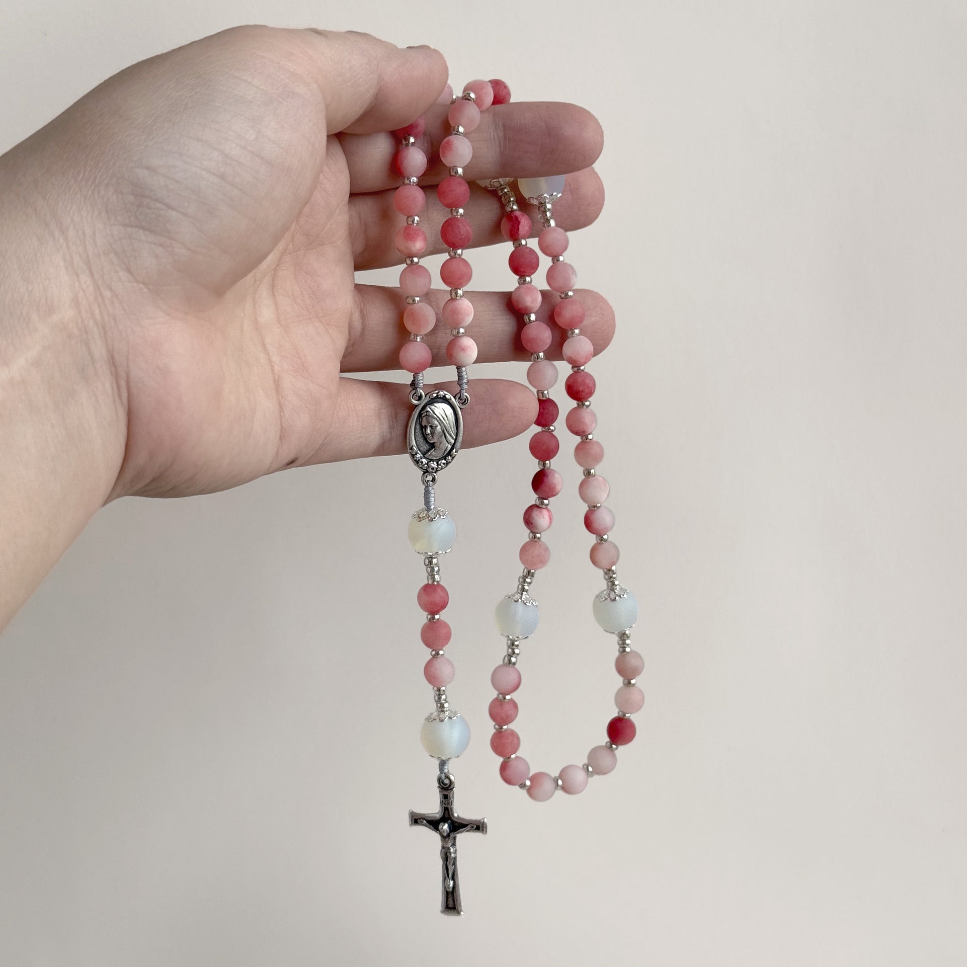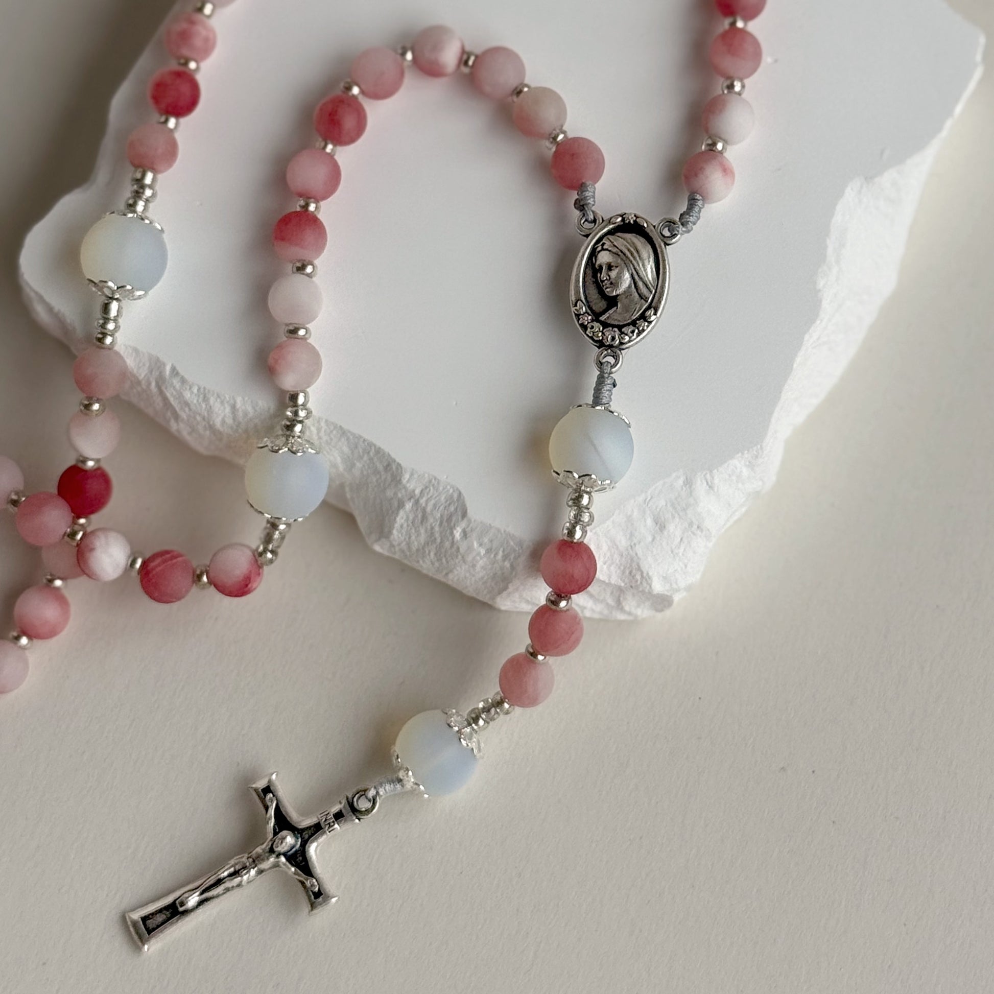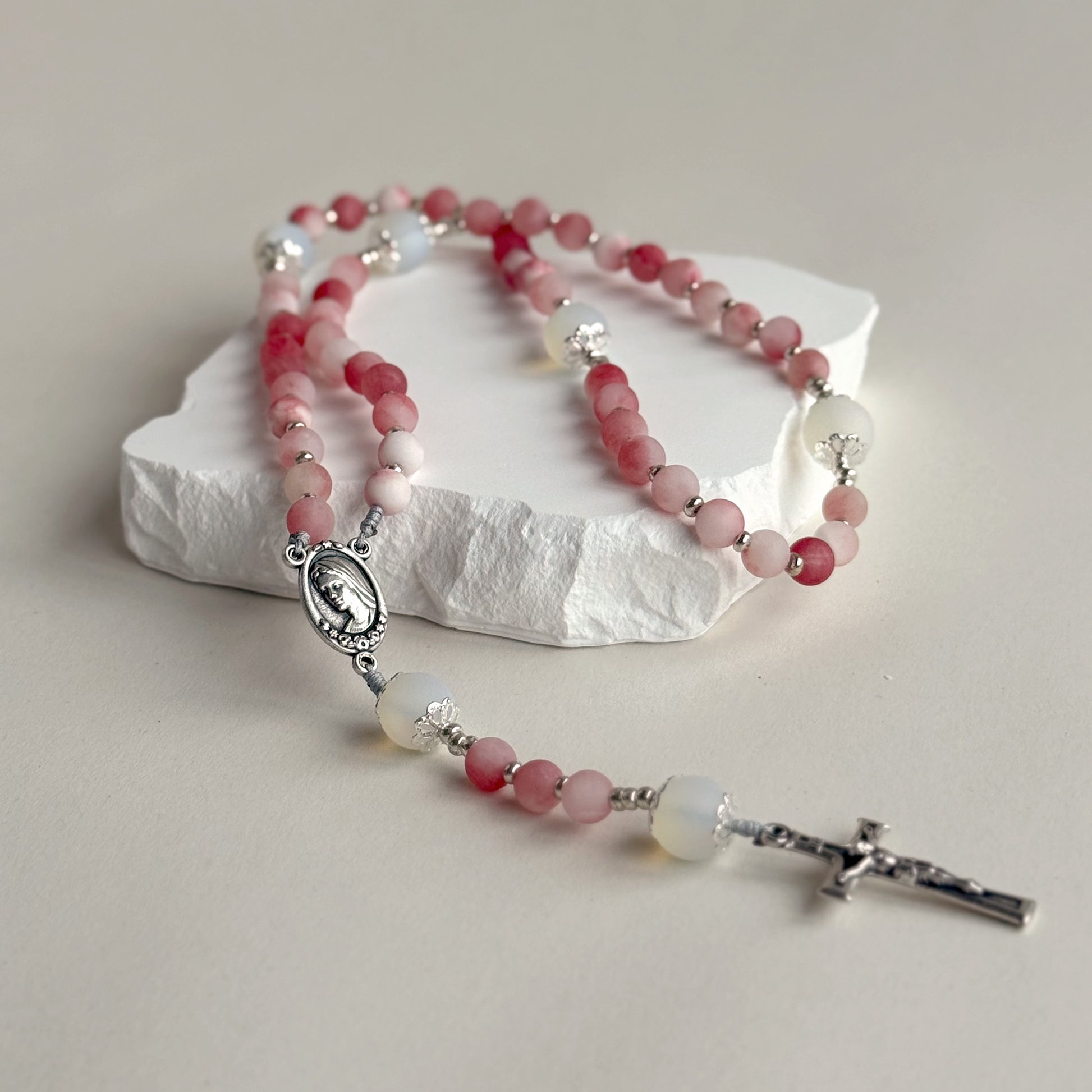 A soft cherry-toned rosary shaped in natural stone, paired with opalescent accents and refined floral details. Gentle yet expressive, this piece carries a warmth that feels both devotional and intimate.