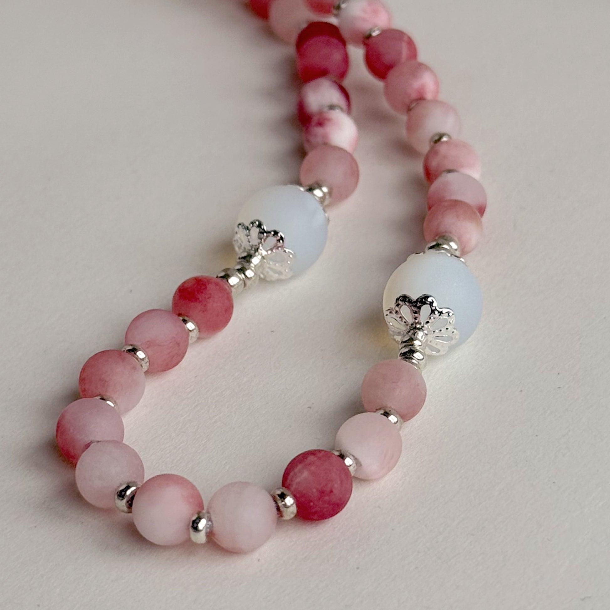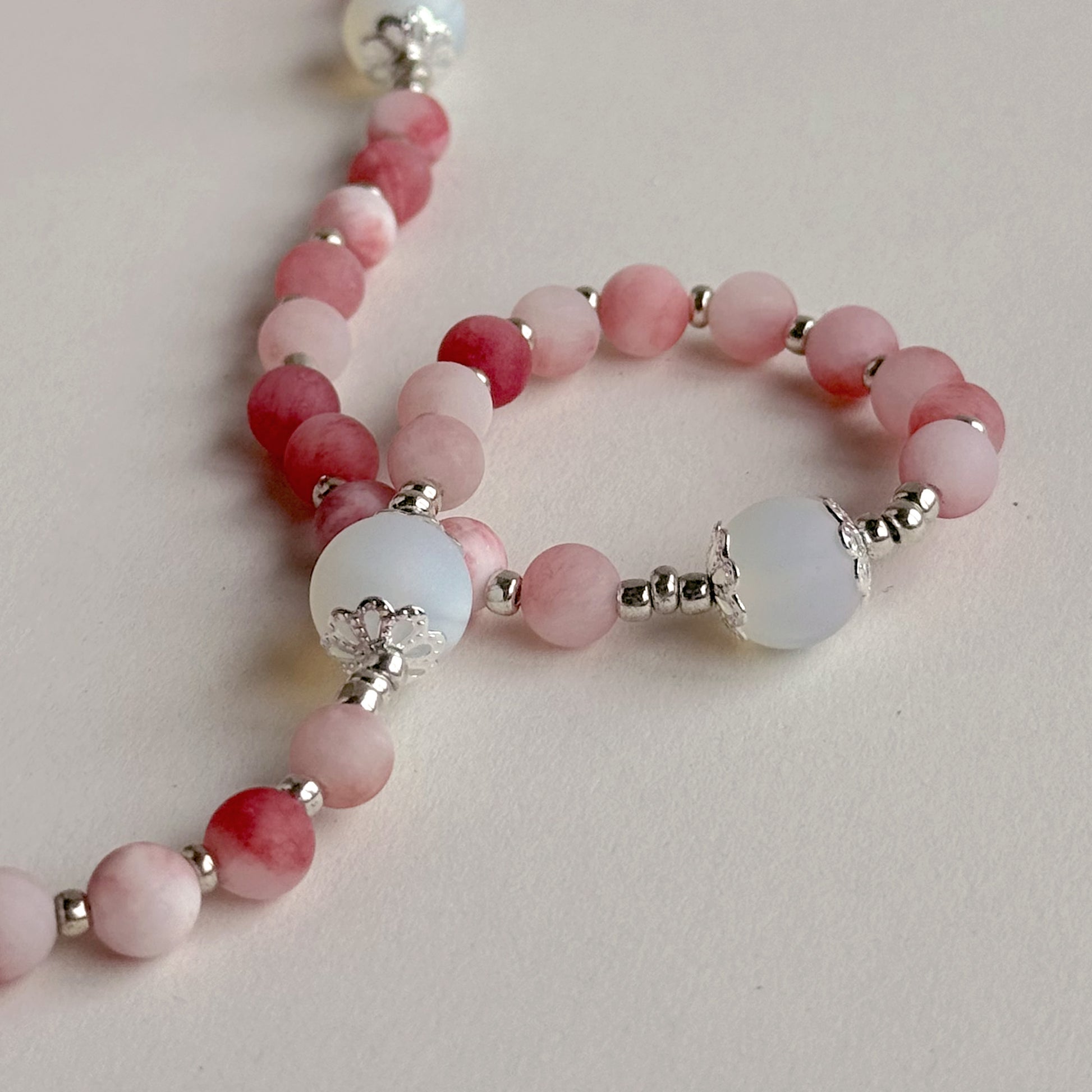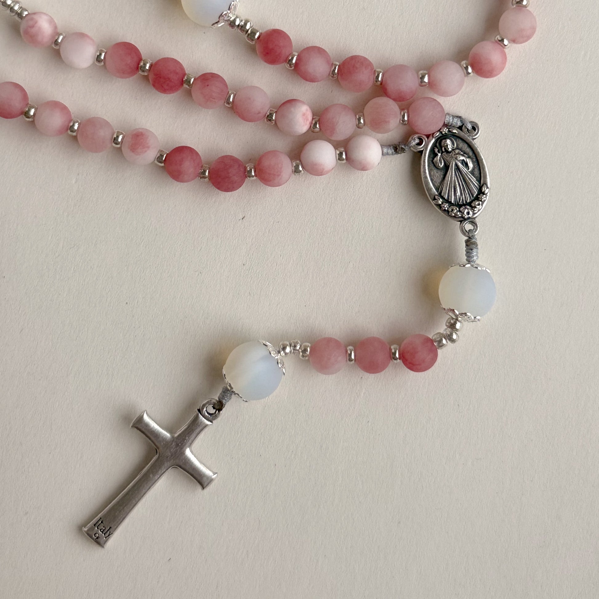A soft cherry-toned rosary shaped in natural stone, paired with opalescent accents and refined floral details. Gentle yet expressive, this piece carries a warmth that feels both devotional and intimate.